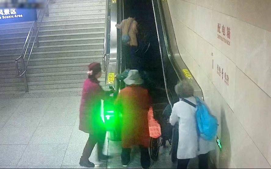 湖北日报讯(记者杨千帆、通讯员李丹、产启斗、邓银雅)3月27日上午10时许,4位七旬老人结伴出行,她们推着2辆轮椅,乘坐地铁8号线到达梨园站前往东湖绿道踏青赏春。他们出站后来到手扶电梯处,一名老奶奶推着轮椅率先上到电梯,由于身前的轮椅占据2个梯级,随着电梯上升,轮椅向后并连带老人身体失去平衡,整个人和轮椅一起向后倾。在电梯下方的一名同行老人放下手中另一辆轮椅,上到电梯试图上前搀扶,另外2名同行也本能地大声呼救:“电梯上摔倒了!”